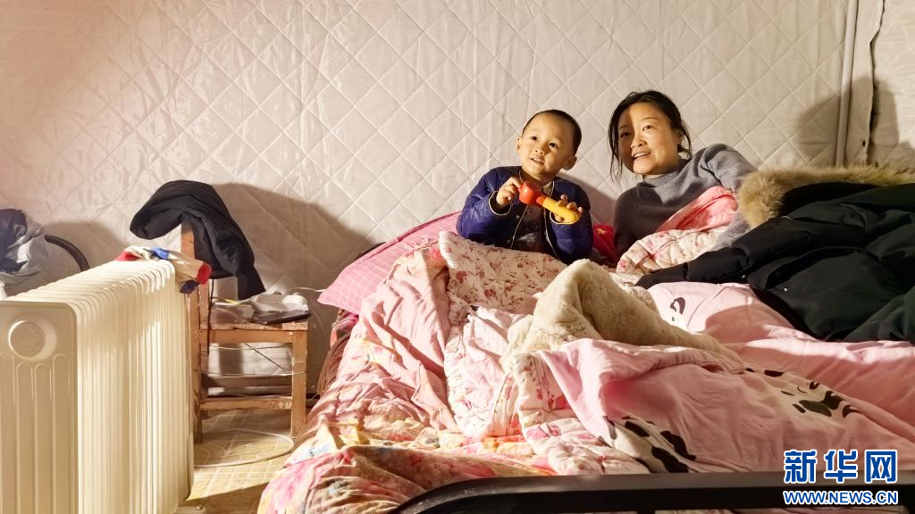 1月23日,在阿合奇县人民广场集中安置点,4岁的吴家豪(左)和家人在帐篷里休息。新华社记者 马锴 摄