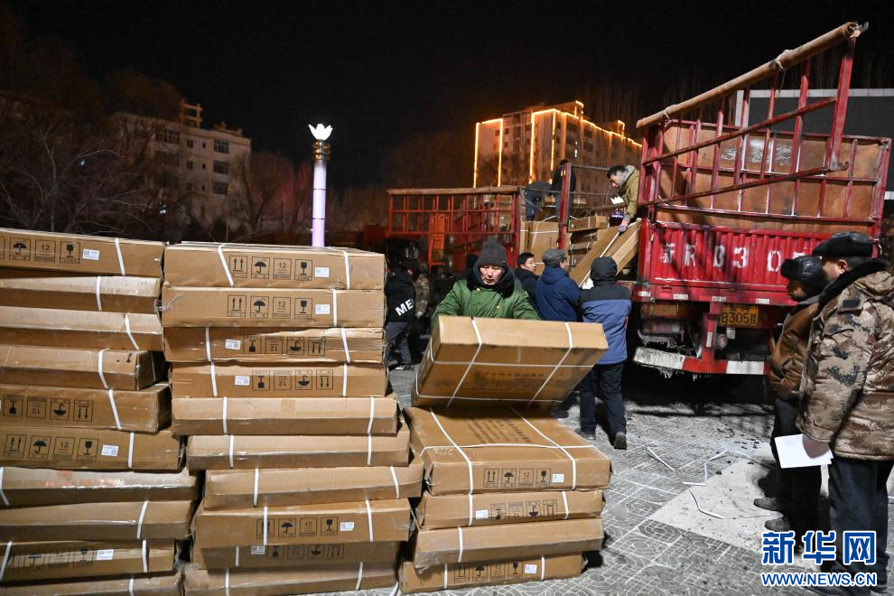 1月23日,在阿合奇县人民广场集中安置点,工作人员在搬运救灾物资。新华社记者 李响 摄pagebreak