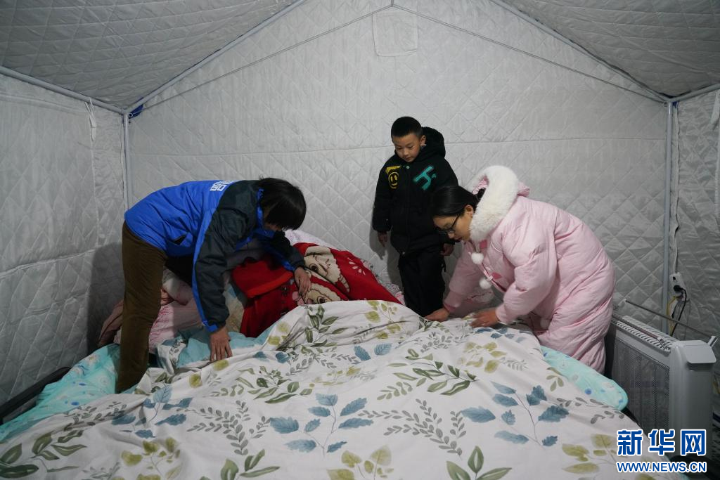 1月23日,在阿合奇县人民广场集中安置点,一户居民在帐篷里铺床。新华社记者 张啸诚 摄pagebreak
