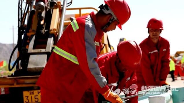 6月15日,新疆“丝路交通杯”主题劳动和技能竞赛(克州赛区),参赛选手在安装波形护栏。自治区总工会提供