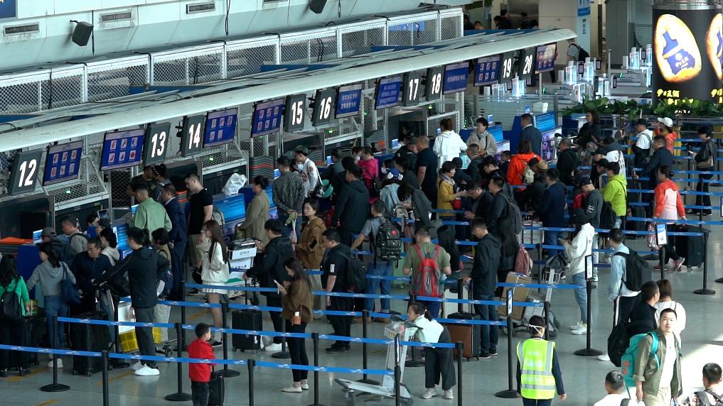 9月22日,旅客正在乌鲁木齐地窝堡国际机场T2航站楼有序排队办理值机手续。(徐德磊 摄)