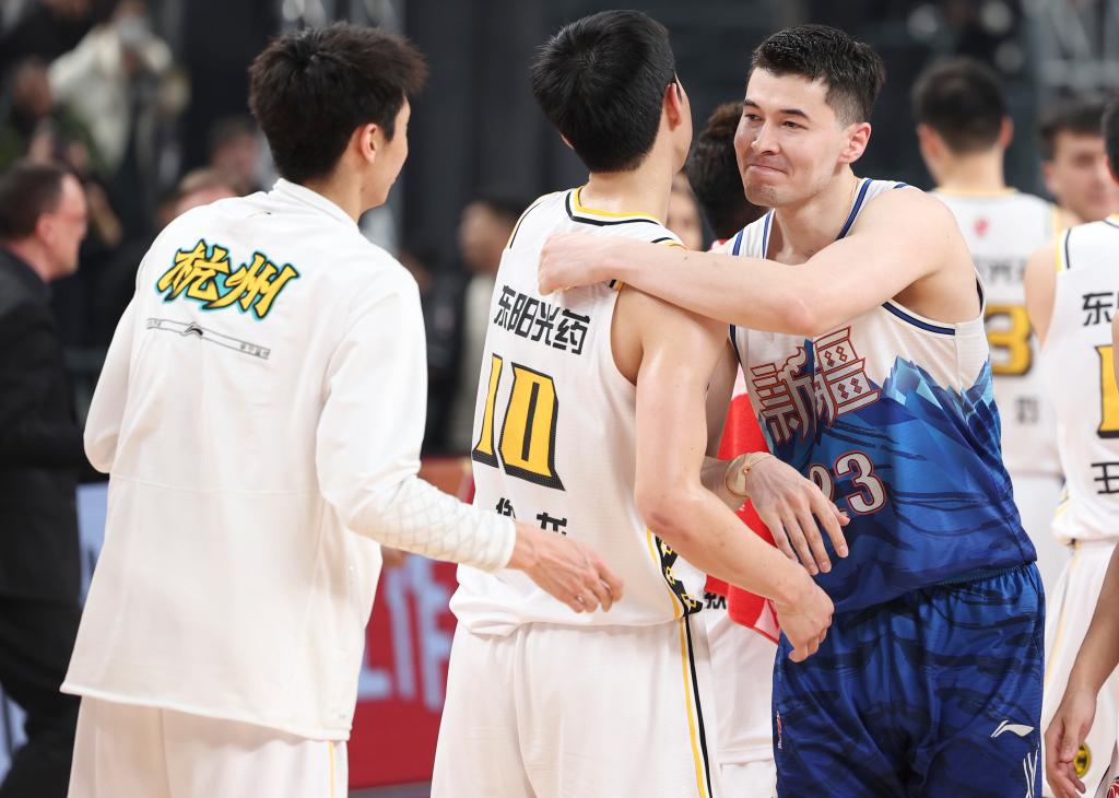 12月27日,新疆伊力特队球员阿不都沙拉木(右)赛后与浙江东阳光药队球员朱俊龙(中)等拥抱致意。
