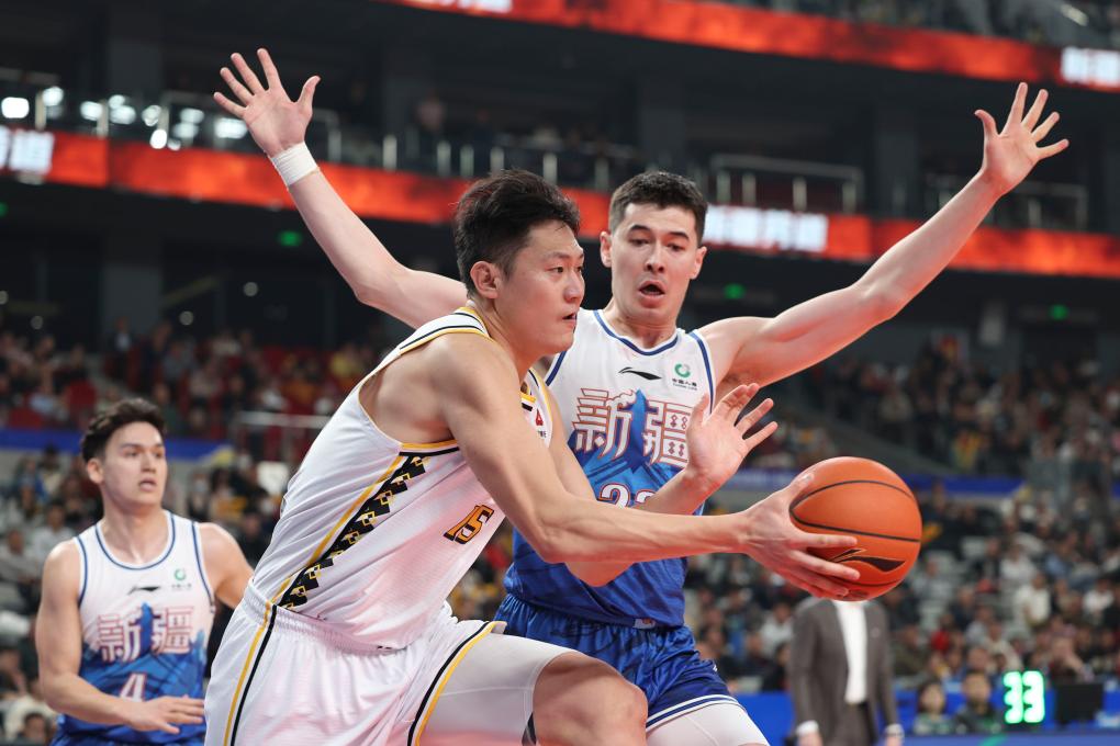 12月27日,新疆伊力特队球员吴冠希(右)与浙江东阳光药队球员吴骁在比赛中拼抢。