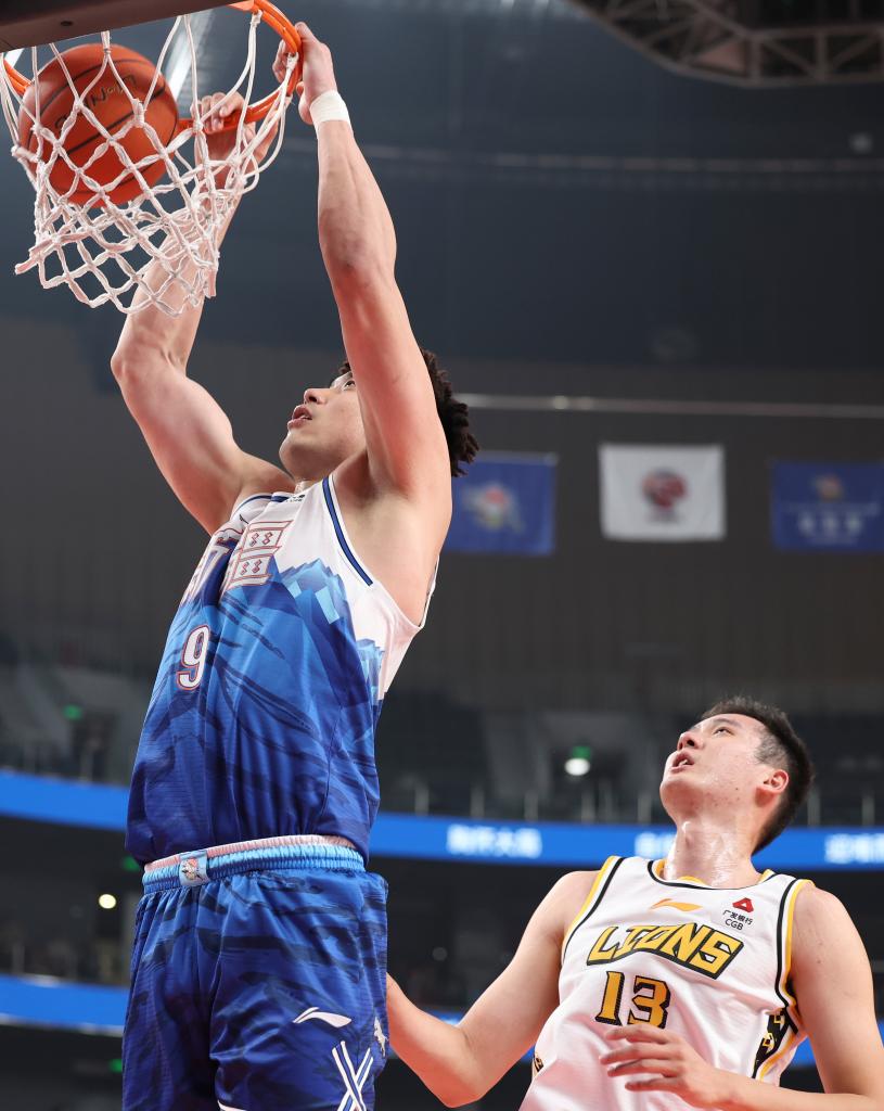 12月27日,新疆伊力特队球员吴冠希(上)在比赛中扣篮。